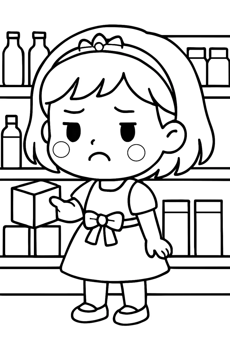 Duygusal ifadeleri öğreten üzgün kız çocuğu boyama sayfası. Mutfak temalı arka plan ile çocukların empati geliştirmesine yardımcı olan eğitici boyama aktivitesi. Yaratıcılığı destekleyen kaliteli çizim tasarımı.
